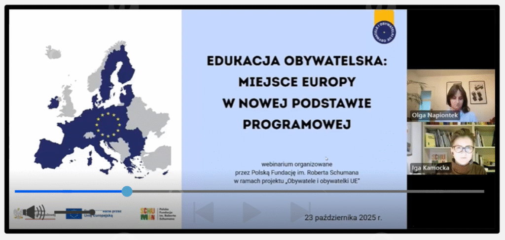 Zapraszamy do obejrzenia nagrania z webinarium 23.10.2025, podczas którego Iga Kamocka, Członkini Zarządu Fundacji Schumana, opowiada czym jest edukacja europejska i jak wpisuje się w nią przedmiot Edukacja obywatelska. Założenia podstawy programowej do przedmiotu Edukacja obywatelska przybliża Olga Napiontek, Wiceprezeska zarządu Fundacji Civis Polonus i członkini zespołu przygotowującego podstawę programową do tego przedmiotu. Elżbieta Olczak, trenerka, współautorka scenariuszy zajęć do działu „Polska w Europie”, przybliża przygotowane materiały.